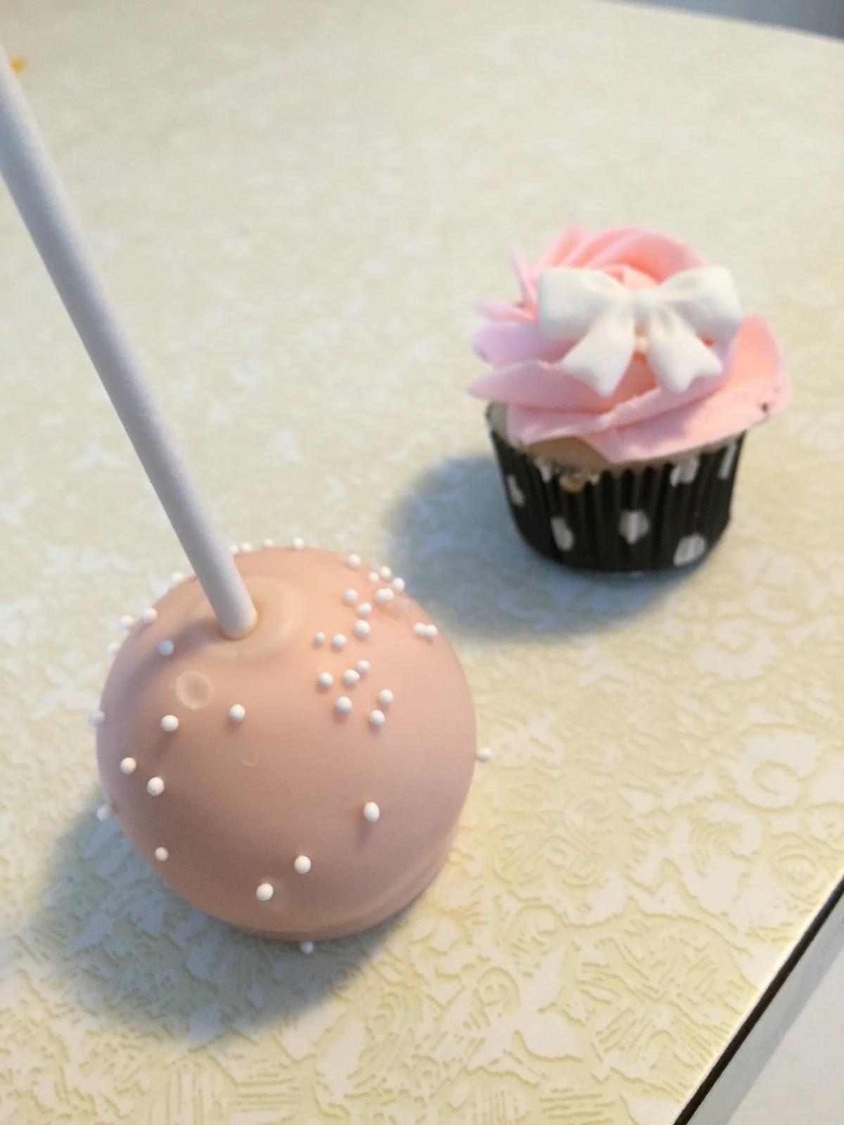 A pink and grey baby shower for Becky's daughter in law. I ended up making both the cake pops and the mini cupcakes. Unfortunately I don't have a pic of all the little cupcakes. I got pretty grey cupcake liners so they looked really cute with the grey straw sticks. The frosting was white with pink bows and pink with white bows. I ended up keeping it simple with no sprinkles as well. Becky said they were a hit!